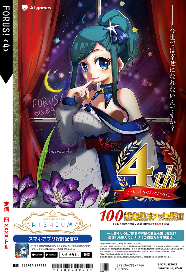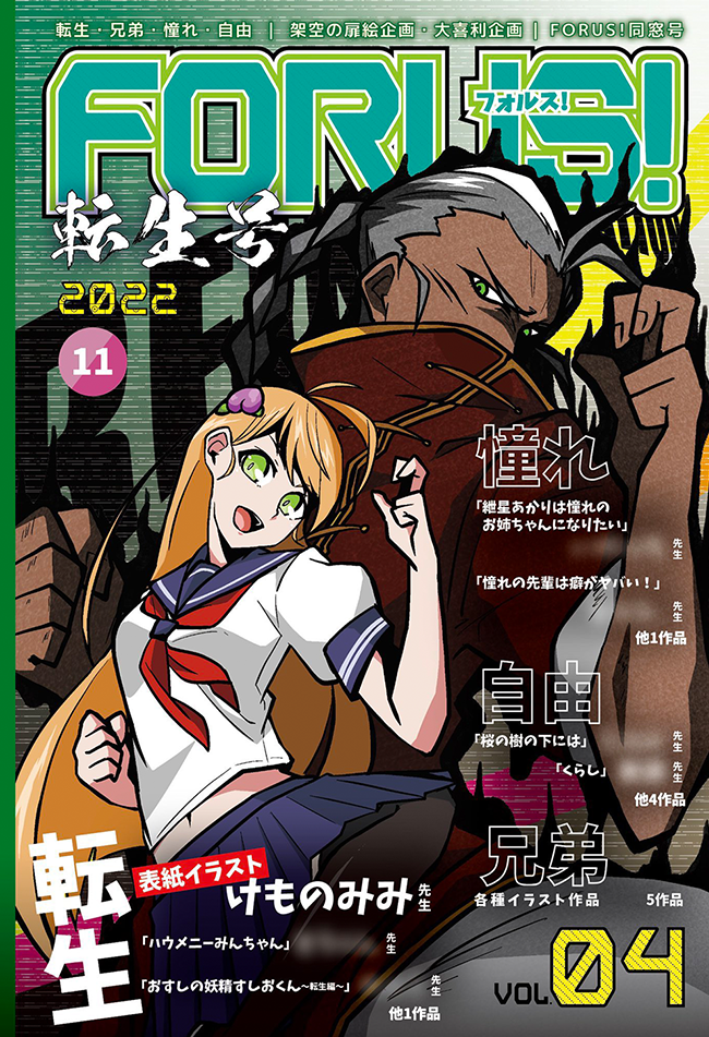 「FORUS!カイミ〜ン号2021」「FORUS!転生号2022」「FORUS!ティータイム2023号」等の五冊の実績があります。2024年冊子も発行予定です。